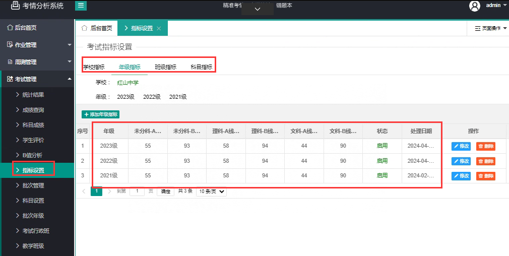 考试成绩分析前,所在年级指标、班级指标、科目指标设置,继承学校预设指标,允许手工调整指标