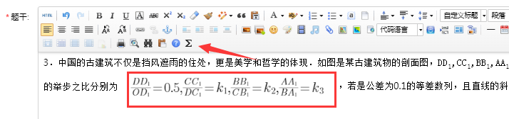 题文内容,在web编辑器内编辑试题内容,注意熟悉编辑器上各按钮使用,大部分科目基本是文字录入+图片上传方式,对数学可能有特殊符号编辑,在web编辑器上使用Σ按钮进入
